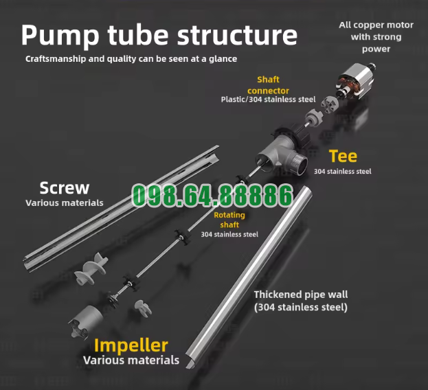 Máy sử dụng cánh bơm inox SUS304 nguyên khối, giúp tăng độ cứng, chịu lực tốt và hạn chế biến dạng khi tiếp xúc với chất lỏng sánh đặc. Nhờ thiết kế này, quá trình hút và đẩy lưu chất diễn ra ổn định hơn, đặc biệt khi bơm các chất có độ bám dính cao.