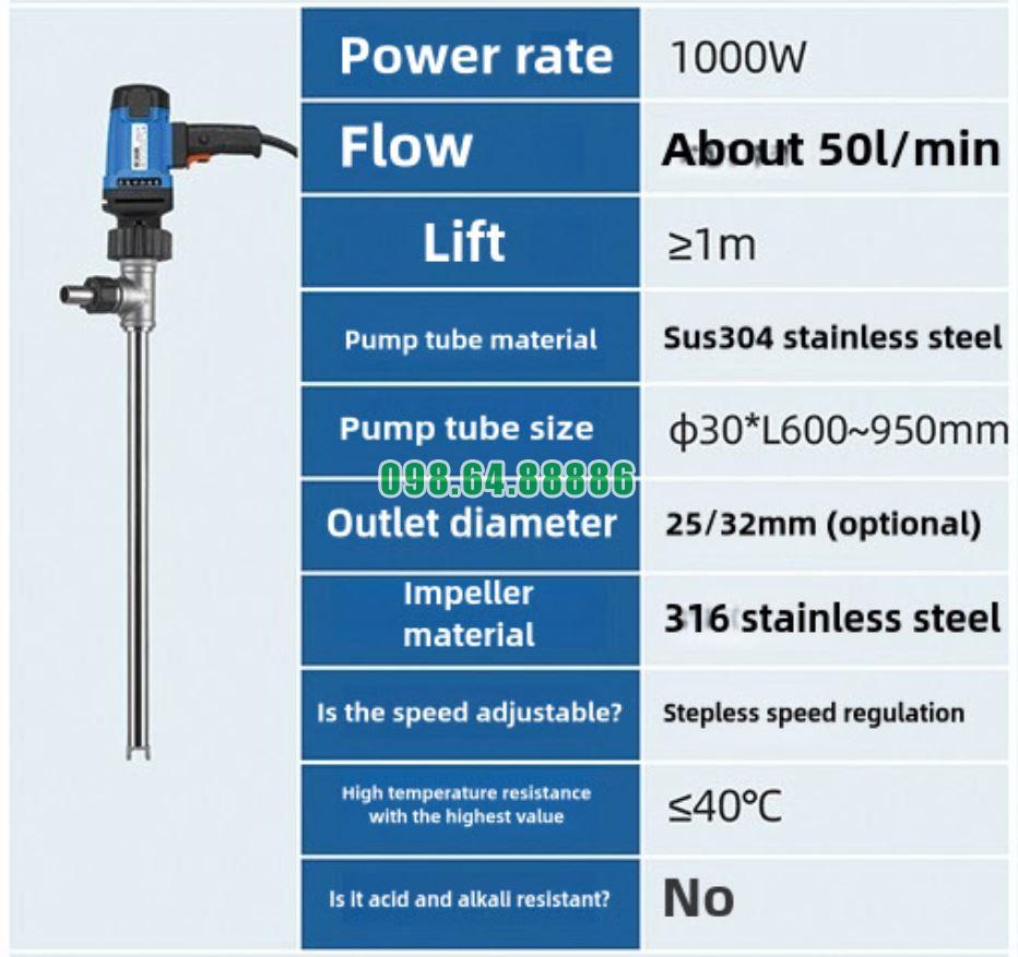 Với khả năng vận hành ổn định, vật liệu inox SUS304 và kết cấu kín, Bơm dầu thùng phuy chạy điện JDT-1000W-30SUS304 là thiết bị phù hợp cho ứng dụng vận chuyển dung môi từ thùng phuy. Việc sử dụng đúng thiết bị giúp nâng cao hiệu quả công việc, giảm thất thoát và đảm bảo an toàn trong môi trường làm việc có dung môi.
