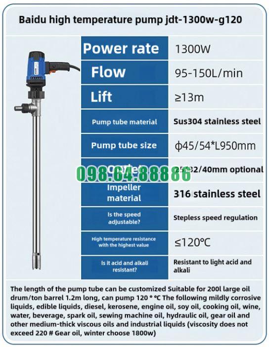 Nhiều hóa chất sau gia nhiệt vẫn có độ nhớt lớn, gây khó khăn cho thiết bị bơm thông thường. Nhờ động cơ 1300W và cánh bơm tối ưu, bơm thùng phuy nhiệt độ cao JDT-1300W-G120: