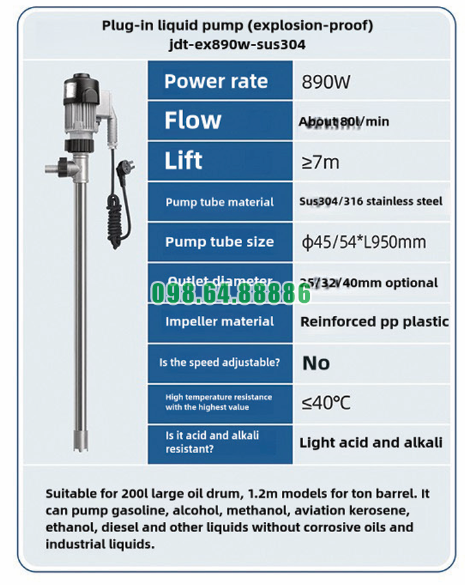 Nhờ đó, Máy bơm chất lỏng cắm trực tiếp chống cháy nổ JDT-EX890W-SUS304 có thể vận hành ổn định mà không bị rò rỉ trong suốt quá trình bơm.