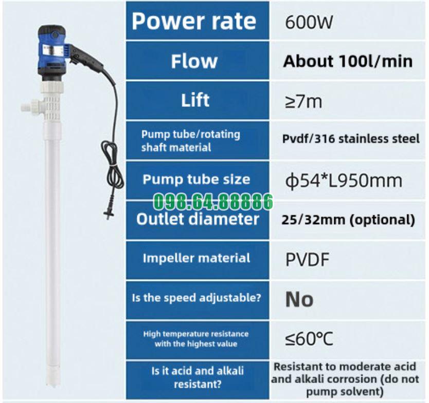 Máy bơm thùng phuy cắm điện JDT-600W-PVDF được xem là giải pháp bền bỉ, an toàn và hiệu quả cho công nghiệp hiện đại.